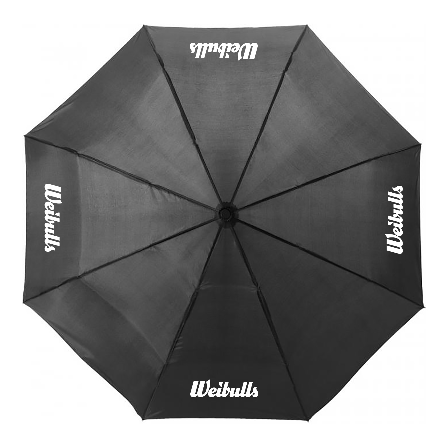 Automatisk paraply med öppnings- och stängningsknapp. Metallskaft, metallribbor och plasthandtag med handledsrem. Inklusive fodral. Polyester.