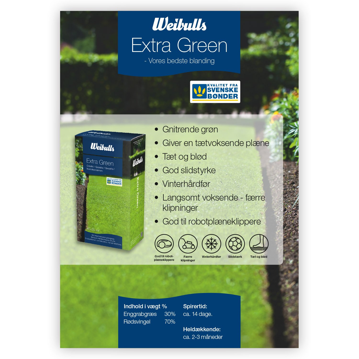 Plastat produktblad med info om gräs extra green. Dansk text.