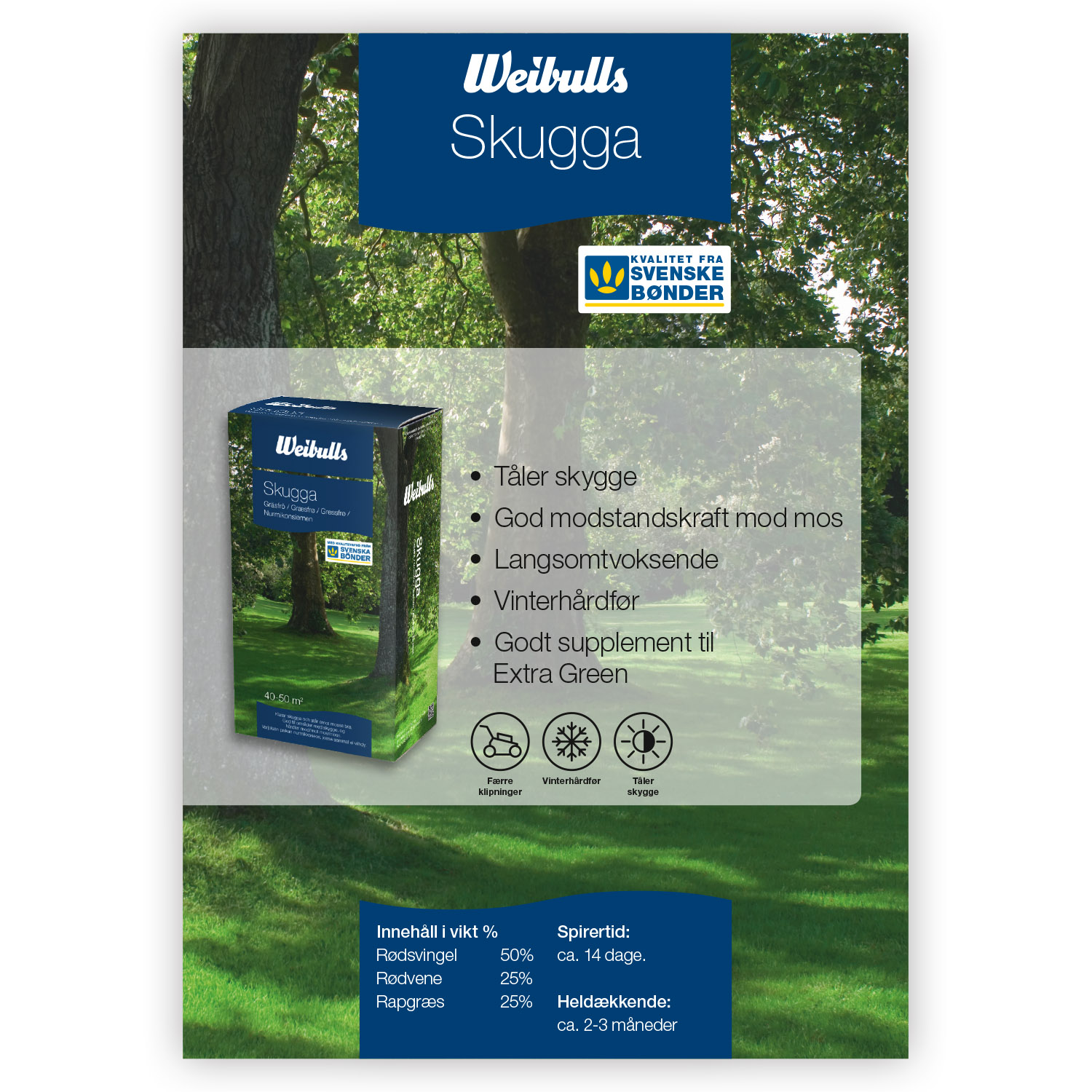 Plastat produktblad med info om gräs skugga. Dansk text.